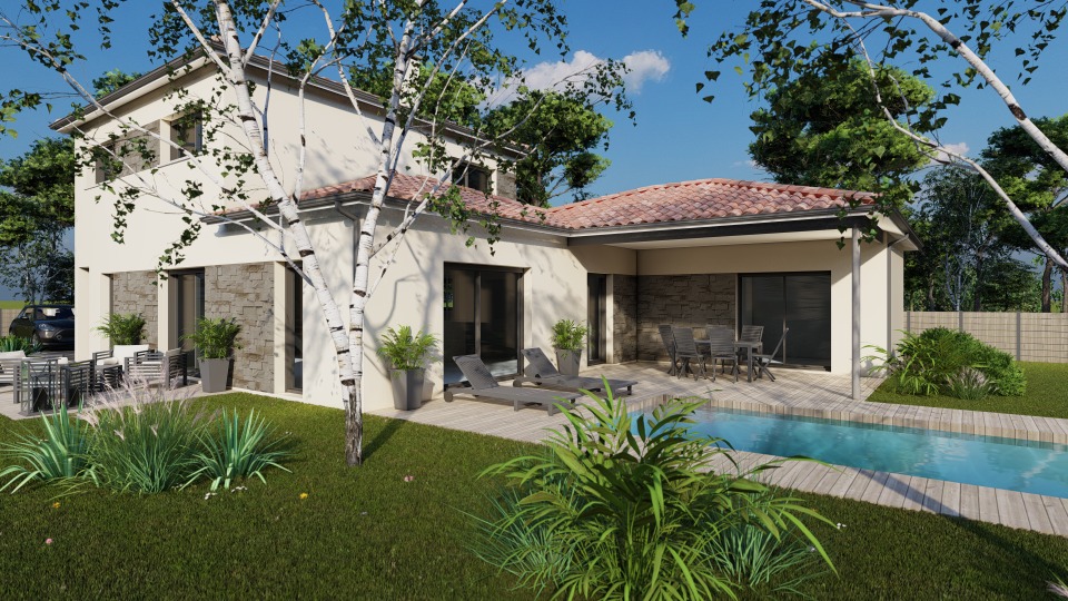 À titre d’exemple, ce terrain peut accueillir une maison d’environ 150 m² avec étage partiel, à l’architecture contemporaine et fonctionnelle. Le projet comprend un garage, quatre chambres, dont une suite parentale, ainsi qu’un espace de vie lumineux ouvert sur le jardin, pensé pour le confort et la vie familiale.